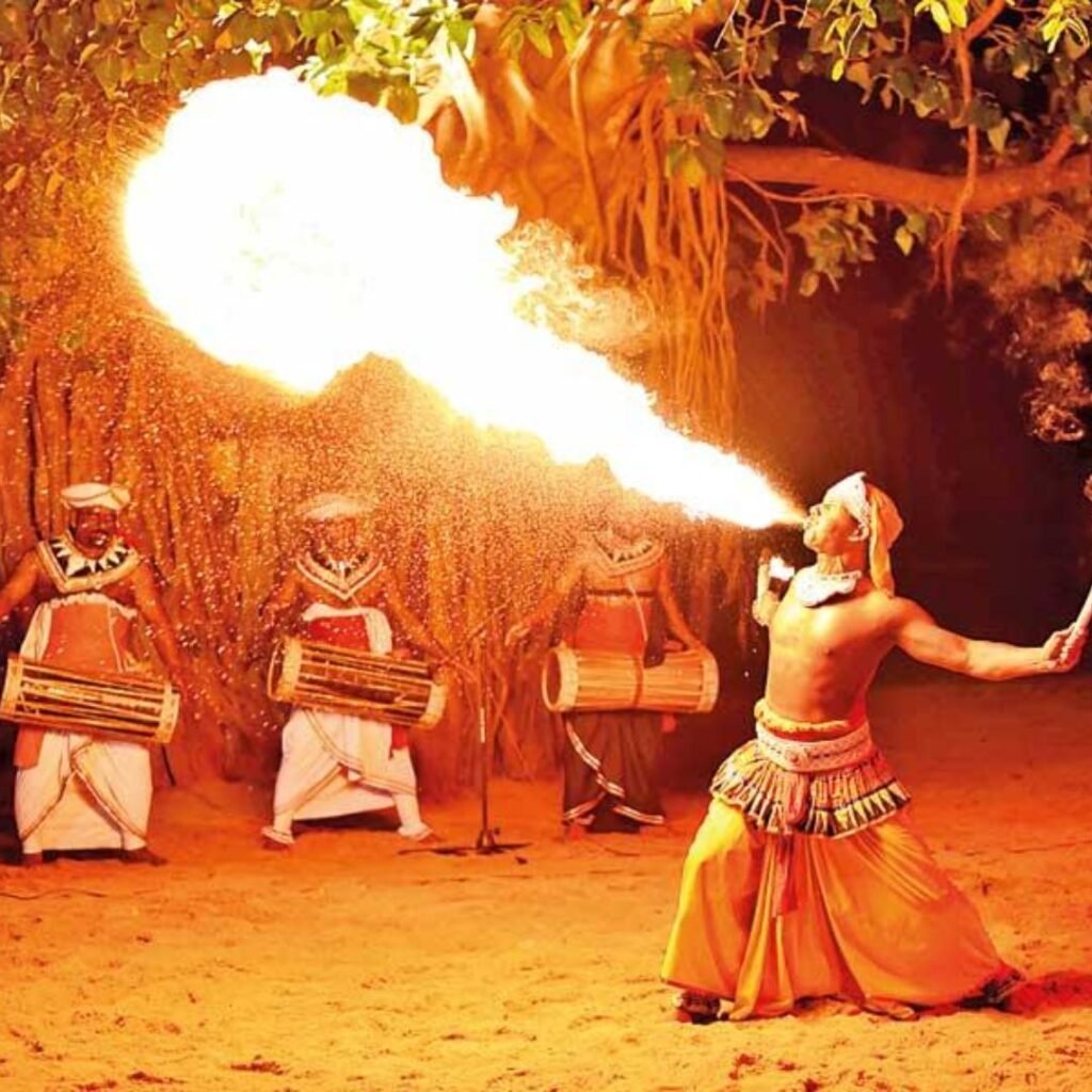 Dancers in vibrant costumes perform to the rhythmic beats of traditional drums, often ending with a dramatic firewalking or fire-breathing act.