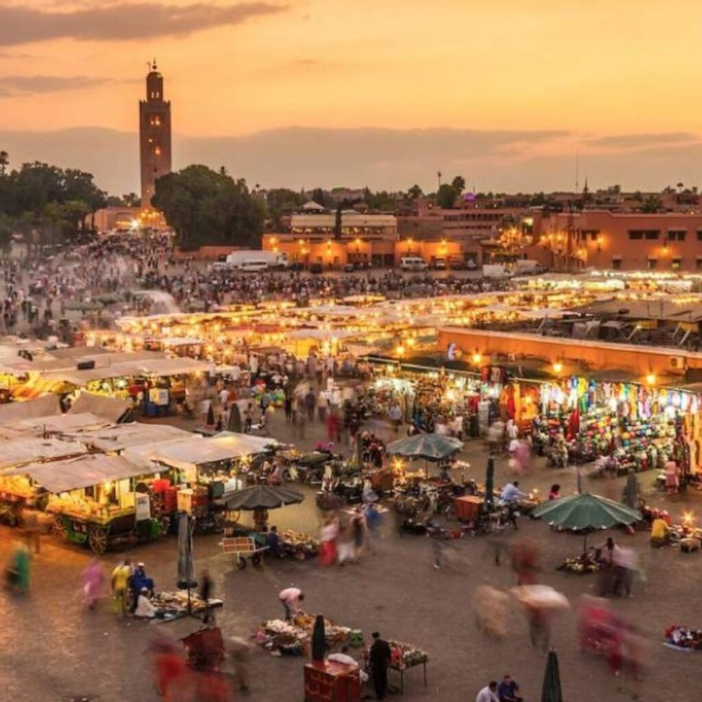 In the heart of Marrakech’s old Medina lies Jemaa el-Fna, one of the world’s most captivating night markets. As evening falls, the square transforms into a glowing maze of food stalls, snake charmers, musicians, and spice vendors.
