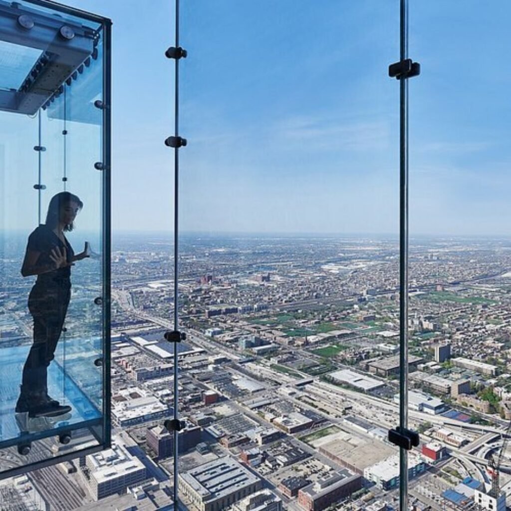On clear days, the Skydeck in Willis Tower, located on the 103rd floor, provides panoramic views of four US states. The Ledge, a glass balcony that extends from the structure and allows you to stand more than a thousand feet above the streets, is the main attraction